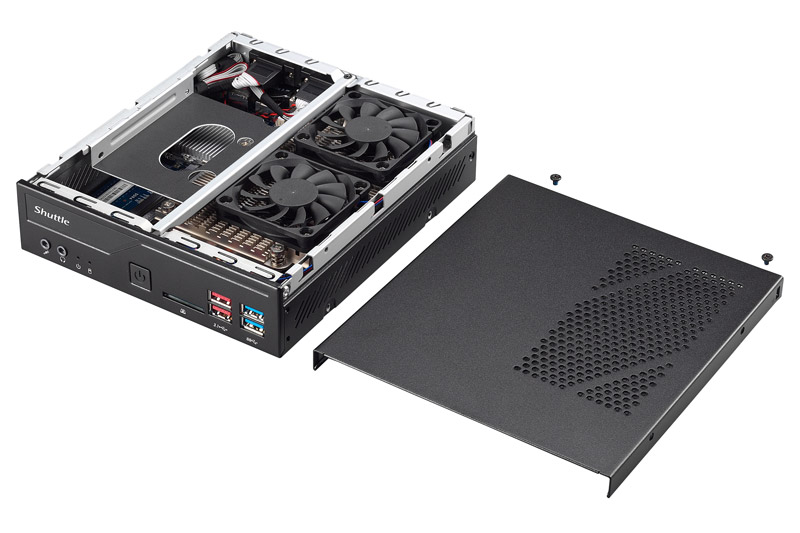 Bei seinen kompakten Abmessungen von gerade einmal 19 x 16,5 x 4,3 cm (TBH) findet sich Platz für ein 2,5-Zoll-Laufwerk (HDD/SSD) sowie eine NVMe-SSD mit M.2-Anschluss. Ein weiterer M.2-Steckplatz in 2230er Länge lässt sich zum Beispiel mit einem WLAN-Modul bestücken. Das Shuttle WLN-M bildet hier das passende Zubehör. Zwei Antennen gewährleisten eine optimale Empfangsqualität.