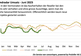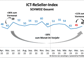 Der Schweizer ICT-Reseller-Index ist zwar von Mai auf Juni saisonal bedingt um +11% gestiegen. Zum Vorjahr liegt er dennoch um -16% hinten. Die Preise im Juni fallen spürbar um -2.8% zum Vorjahr und sogar um -5% zum Vormonat Mai. Dies ist ein Indiz für volle Lager bei Herstellern und Grosshändlern.