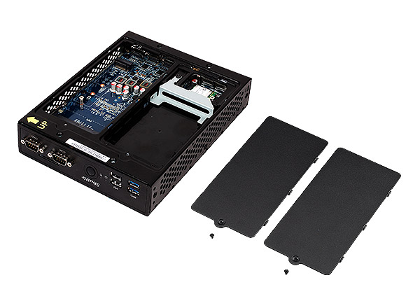 Löst man die zwei Schrauben beider Abdeckungen des robusten Stahlgehäuses, kommt Platz für ein 2,5-Zoll-Laufwerk in Form einer Festplatte oder SSD und zwei SO-DIMM-Sockel, die bis zu insgesamt 32 GB DDR4-Speicher aufnehmen, zum Vorschein. Ein M.2-2280-Steckplatz steht für zusätzliche, schnelle NVMe-Speicherkarten bereit. Ein zweiter M.2-Slot ist bereits mit einem WLAN-Modul ausgerüstet.