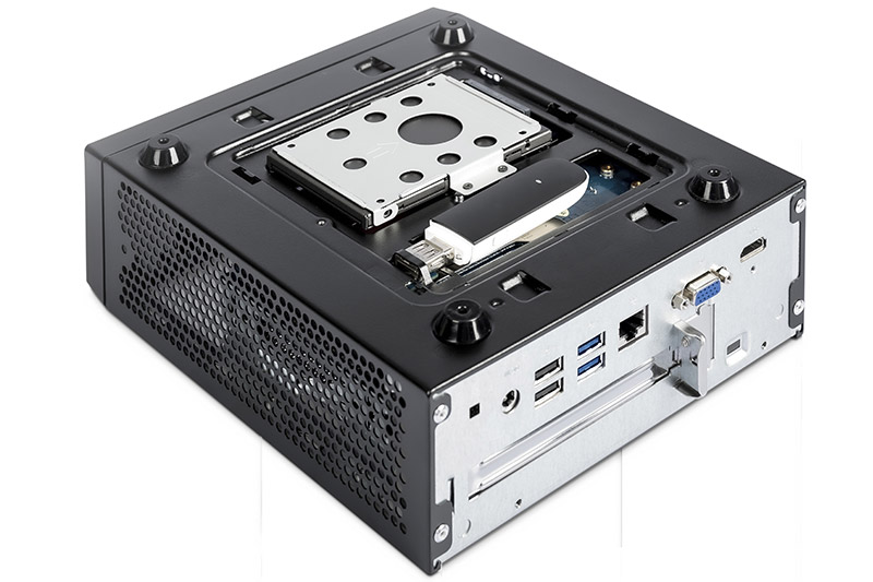 Das Gehäuse verfügt über Belüftungsöffnungen im Gehäusedeckel und zusätzlich Platz für eine 2,5-Zoll-Festplatte/SSD auf der Unterseite, der durch eine separate Klappe erreichbar ist. Direkt neben genanntem Datenträger befindet sich ein konventioneller USB-Anschluss (Typ A), den man etwa für Dongles, diebstahlgesicherte Datenträger oder Erweiterungen wie Mobilfunk-Module nutzen kann.