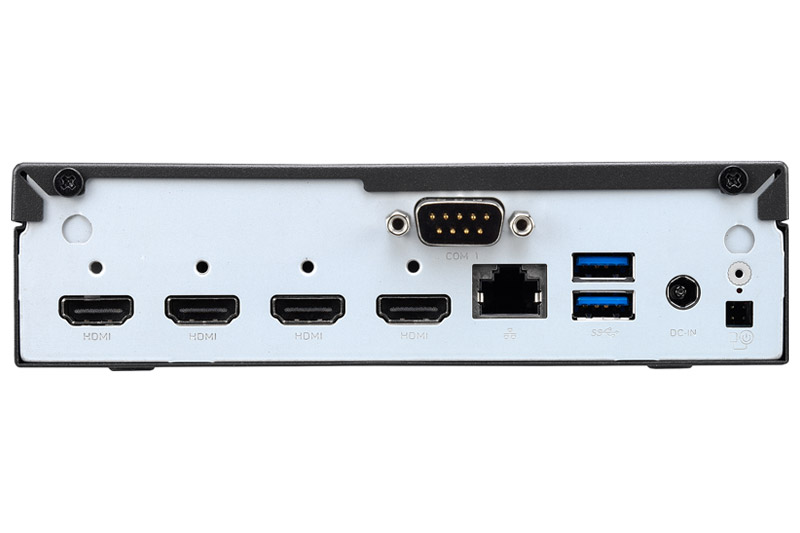 Bei minimalen Abmessungen von 19 x 16,5 x 4,3 cm (LBH) wartet das DH02U auf der Rückseite neben den vier HDMI 2.0b-Anschlüssen, mit Intel Gigabit Ethernet, USB 3.0, RS-232 sowie einem 4-Pin Anschluss für einen externen Power-Button auf. Auf der Vorderseite verbindet sich das DH02U über je 2x USB 3.0 und USB 2.0 mit Peripherie. Ebenso findet man hier die Audio-Anschlüsse. Als Betriebssysteme eignen sich Windows 10 (64-Bit) und Linux (64-Bit).