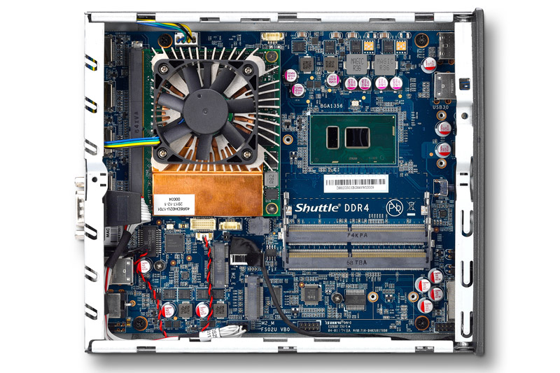 In der Produktkategorie „XPC slim“ wird das DH02U standardmässig als sogenanntes Barebone ausgeliefert, bei dem neben der CPU und dem erwähnten Grafikchip das Gehäuse, Mainboard, Kühlsystem und das lüfterlose 120-Watt-Netzteil enthalten sind. Im DH02U arbeitet ein Intel Celeron 3865U Dual-Core-Prozessor im Basistakt von 1,8 GHz, wobei das DH02U5 mit Intel Core i5-7200U Prozessor auf bis zu 3,1 GHz und 4 Threads zurückgreifen kann. Die moderne 14-nm-Mikroarchitektur, sowie die maximale Verlustleistung von rund 15 Watt stehen für einen geringen Energieverbrauch.