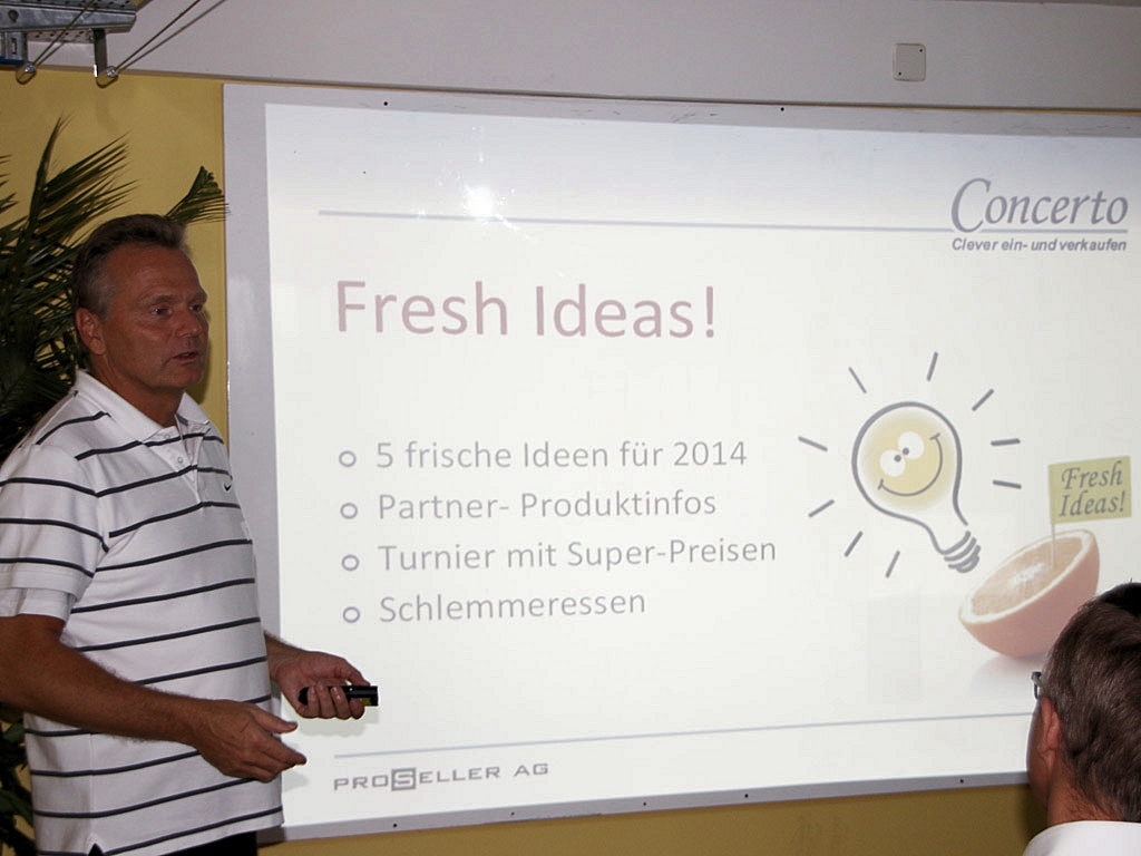 Informationsanlass mit vielen Tipps, Tricks und Neuheiten: Am 14. Januar 2014 präsentierte Alfred Rossi von ProSeller die neue Concerto-Innovation OrderCockpit – das OrderManagement-Tool für die automatisierte, kostengünstige und ERP unabhängige Auftragsabwicklung. Nebst neuen E-Commerce-Ideen und verschiedenen Partner-Beiträgen erwartete die geladenen Reseller ein spannendes Tischfussball-Turnier mit coolen Preisen im Gesamtwert von 3’000 Franken. Bei einem feinen Nachtessen konnten die Reseller und Partner zusätzlich Erfahrungen austauschen und Kontakte knüpfen.