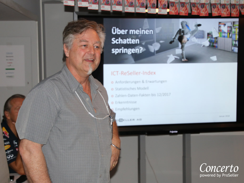 Die schnelle, digitale Transformation bedingt ein rasches Umdenken und Handeln. Wer nun erfolgreich über seinen eigenen Schatten springt, kann sein Potenzial besser ausnutzen. Alfred Rossi zeigte eindrücklich auf, wo die Chancen, aber auch die Gefahren für Schweizer Reseller im 2018 liegen. Das innovative Schattensprungkonzept überzeugte die Reseller. Auch die Ausführungen von Thomas Czekala, Verwaltungsrat ProSeller, zum ICT-ReSeller Index mit den daraus resultierenden Empfehlungen waren für die Teilnehmer sehr aufschlussreich.
