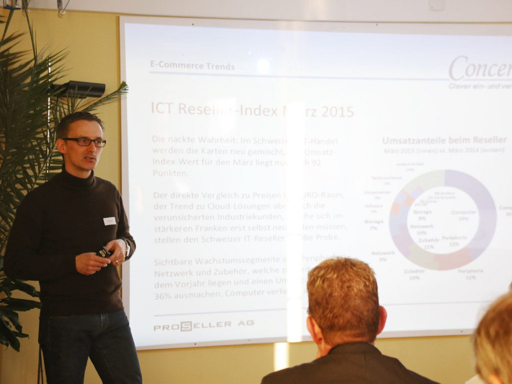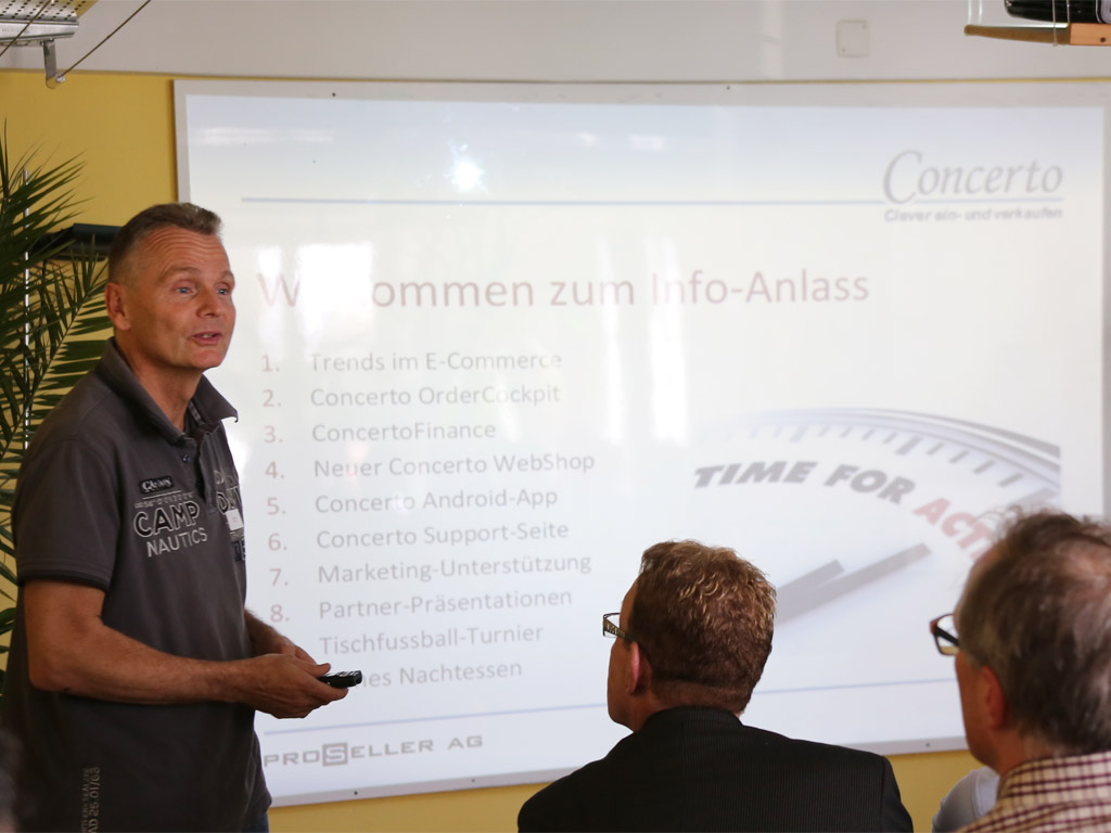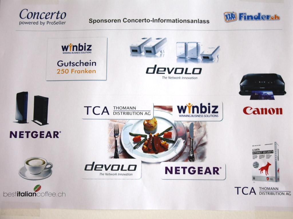 Volles Haus in Herrliberg: rund 40 Reseller und Partner informierten sich über die neusten Concerto-Leistungen OrderCockpit, ConcertoFinance, Concerto App, und den neuen Webshop. Auch die Partner Devolo, Netgear, TCA Thomann und Italian Coffee überzeugten mit interessanten Beiträgen und italienischem Kaffee, bevor es zu heissen Fights und feinem Essen ging.