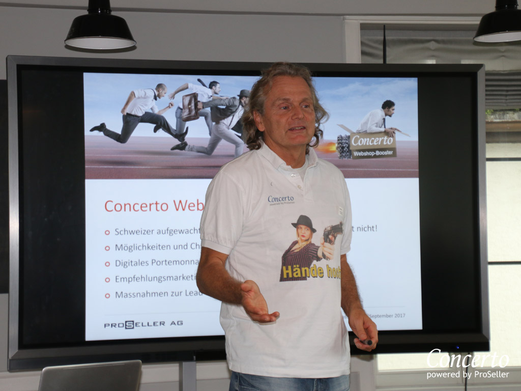 „Es macht immer Spass mit euch!“ Trotz Regen und Kälte war die Stimmung beim Webshop-Booster-Event in Herrliberg glänzend. Die ausführliche Schulung zur neuen Webshop-Version überzeugte die Reseller, einiges mehr noch aus ihrem Shop herauszuholen. Auch die neuen Partner-Leistungen von sobu und Masterpass fanden grossen Anklang. Das Concerto-Team rüttelte mit Facts auf, präsentierte Lösungen, begeisterte mit Spiel und Spass und lud erst noch zum Networking-Schlemmeressen ein.